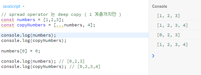 - Spread Operator 는 기본적으로 1 depth 까지만 Deep Copy 를 수행함.