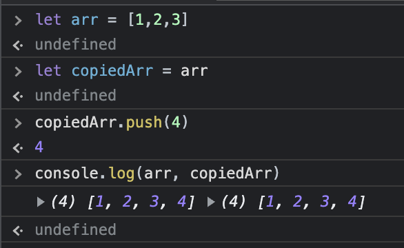 새로운 배열 변수 ( copiedArr ) 에만 4 값을 추가로 넣어주었음에도 기존 배열 변수 ( arr ) 값이 함께 변경된 것을 확인할 수 있다.
