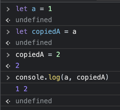기존 변수 ( a ) 를 복사해서 다른 변수 ( copiedA ) 에 할당해 준 다음, 다른 변수 ( copiedA ) 를 변경해도 기존 변수 ( a ) 에는 영향을 주지 않는다.